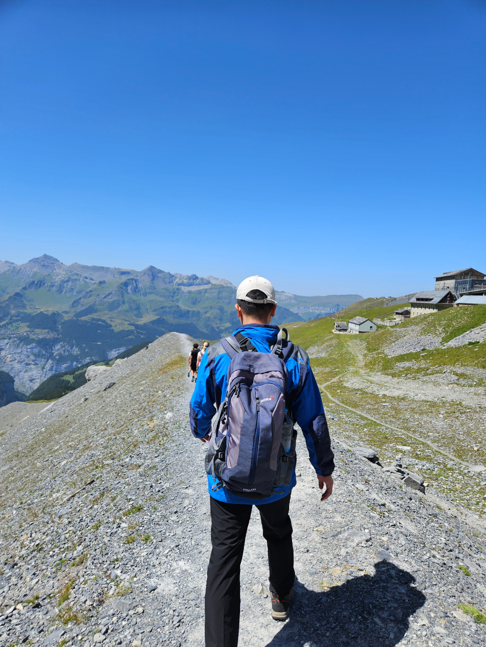 길은 초반부터 돌길과 흙길이 번갈아 이어졌고 양옆으로는 푸른 잔디와 만년설 자락이 어우러져 있었다. 걸음을 옮길 때마다 아이거 북벽이 가까워졌다 멀어지기를 반복했고, 멀리 보이는 마을과 기찻길은 시간이 느리게 흐르는 듯 천천히 배경이 되어주었다.