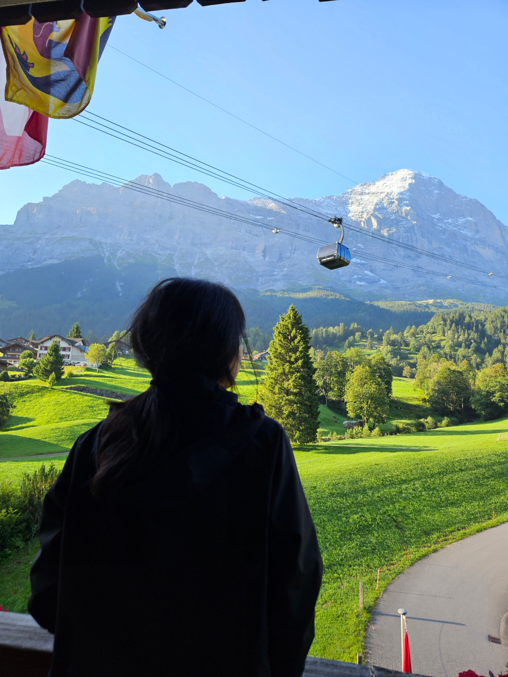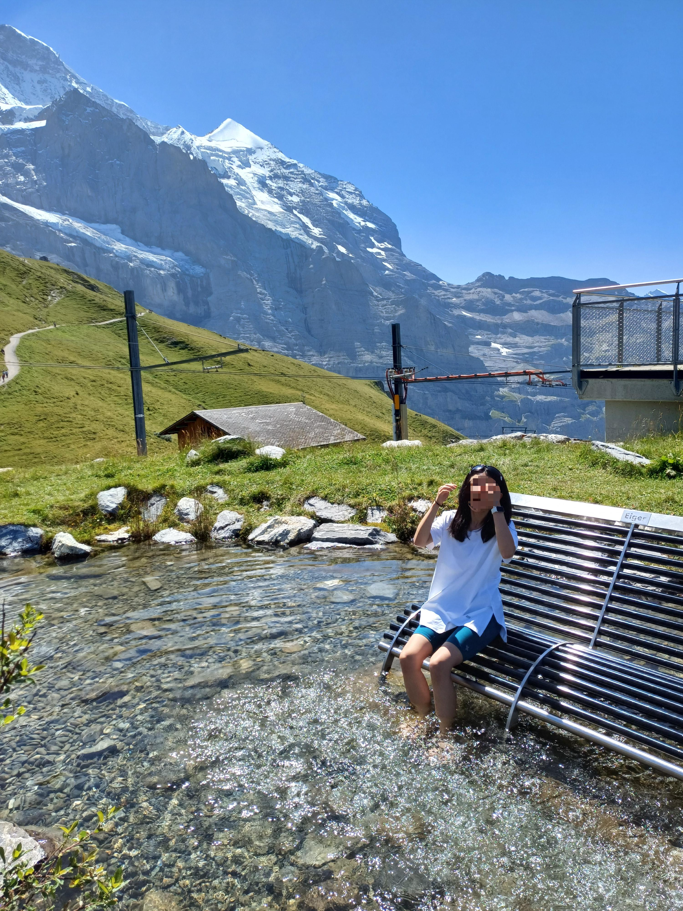 날씨가 맑아 눈 덮인 아이거 북벽과 푸른 하늘이 선명하게 보였는데 이곳에서 잠시 멈춰 서 있는 것만으로도 스위스 여행의 진가를 느낄 수 있었다. 특히 마음에 들었던 건, 역 주변으로 탁 트인 능선과 계곡이 한눈에 내려다보인다는 점이다. 잠깐 머무르는 시간이었지만, 벌써 정상에 닿은 기분이었다.