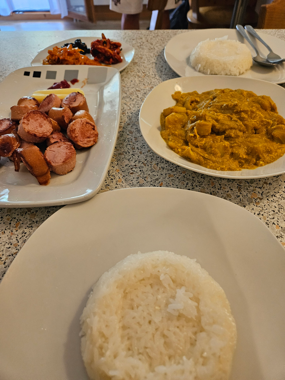 샬레에서 저녁 마무리: 쿱에서 산 식재료로 만든 카레와 소시지
